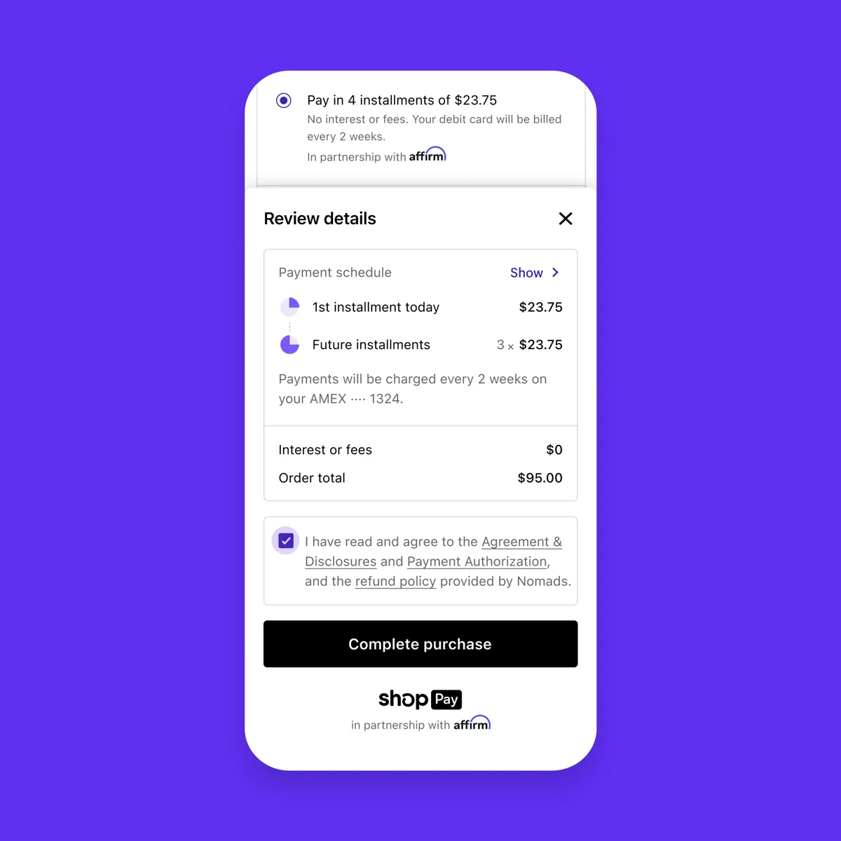 Your first payment is due at checkout. The remaining payments are automatically charged to your card saved on Shop Pay based on the payment plan you chose. You'll get an email reminder before each payment.